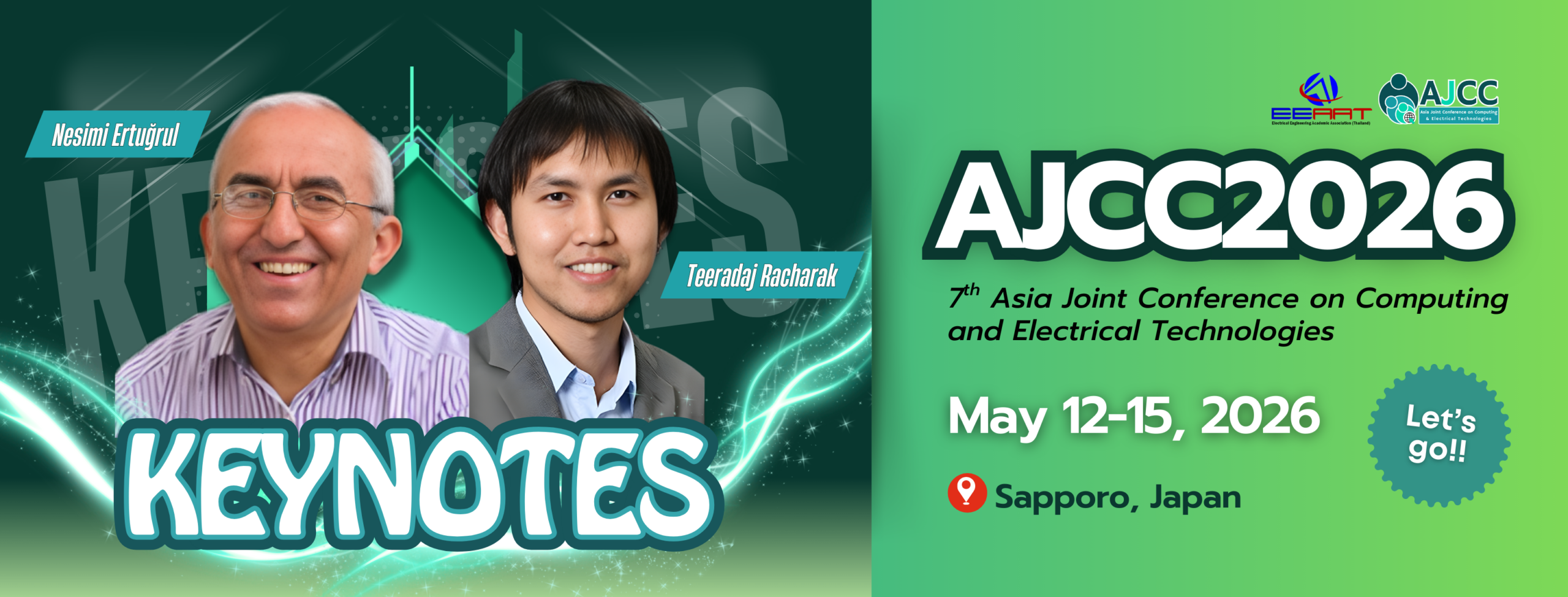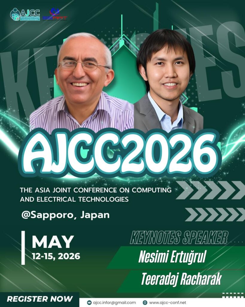 Jan 29, 2026: We are proud to present our distinguished Keynote Speakers for AJCC2026: Prof. Nesimi Ertuğrul, Ph.D., Adelaide University and Assoc. Prof. Teeradaj Racharak, Ph.D. Tohoku University, Join us in Sapporo, Japan (May 12–15, 2026) for the 7th Asia Joint Conference on Computing and Electrical Technologies (AJCC2026), where leading experts will share cutting-edge research, real-world innovations, and future perspectives in computing and electrical technologies. Link to Keynote: https://www.ajcc-conf.net/keynote-speaker/